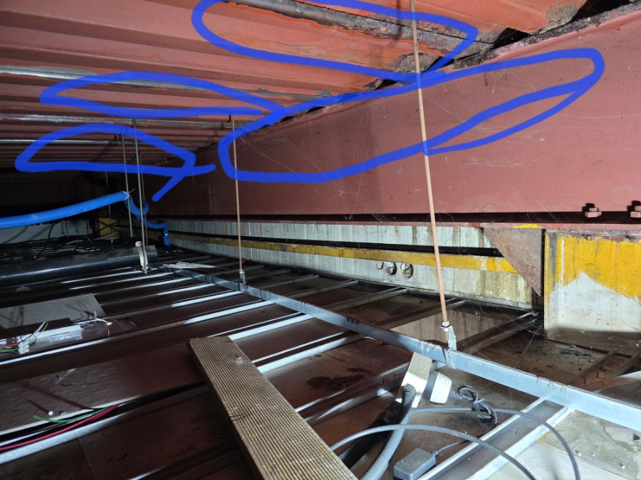 천장 내부를 확인해보니, 철판 구조물(H빔) 아래쪽에 녹이 슬며 물방울이 맺히는 부분이 있었습니다.