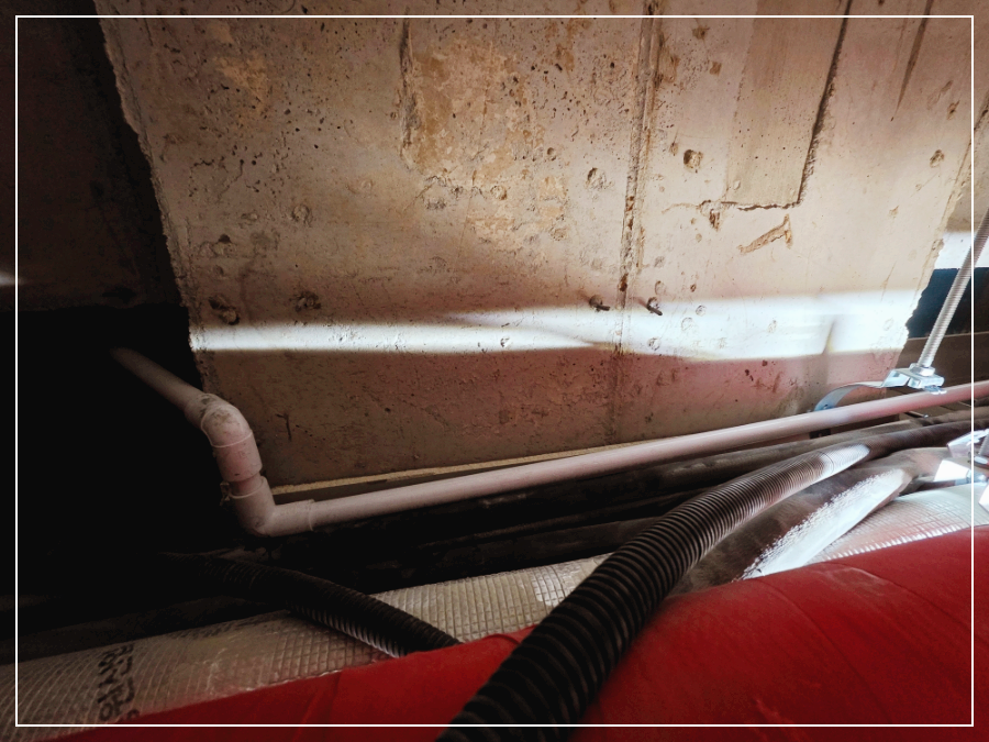 벽 모서리를 따라 배관을 아래층으로 빼내어 싱크대 하수배관에 연결했습니다. 이렇게 하면 위층 샤워실에서 새는 물이 천장에 고이지 않고 바로 배수됩니다.